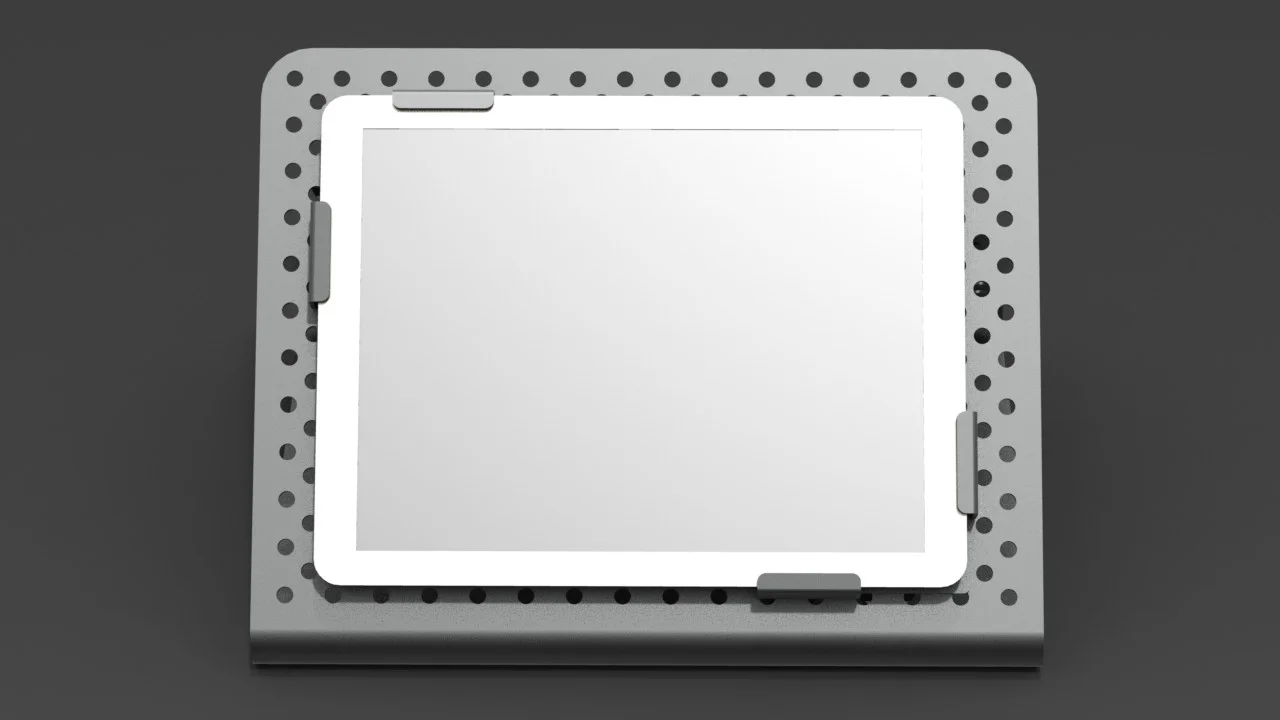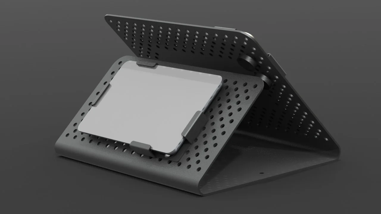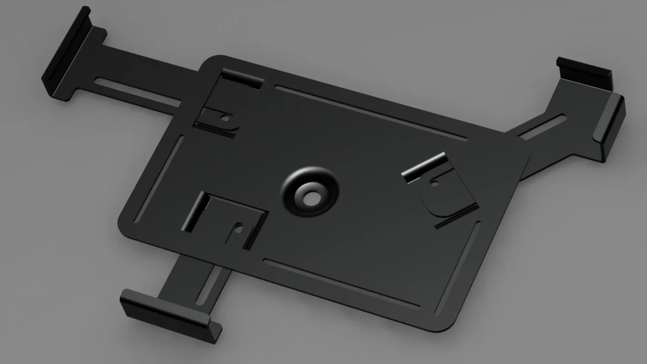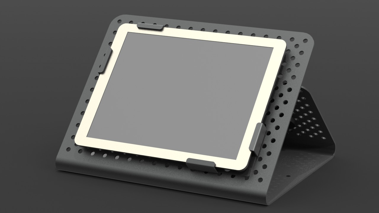 The Universal Tablet Mount is a design I created for Pad-Grip (now Mob Armour). It's an adjustable bracket that can accommodate a tablet of any dimension and interfaces with Pad-Grip's swivel ball mount system. It is currently on the market and can be purchased at https://mobarmor.com/tab-mount/.